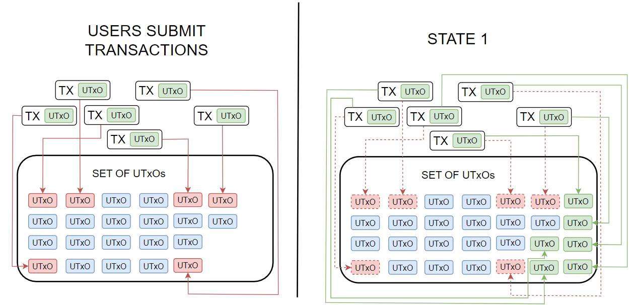 Hình ảnh minh họa việc người dùng gửi liên tục và song song các giao dịch mới. Mỗi giao dịch trỏ đến các UTXO đầu vào từ bộ UTXO, được biểu thị bằng các mũi tên màu đỏ dẫn đến các UTXO màu đỏ. Thuật ngữ STATE 1 thể hiện trạng thái global mới xuất hiện trên mỗi node sau khi chấp nhận một khối mới. Các UTXO màu đỏ đã bị xóa khỏi bộ UTXO. Bộ UTXO đã được cập nhật với việc bổ sung các UTXO mới được hình thành, được mô tả bằng các mũi tên màu xanh lá cây hướng về phía các UTXO màu xanh lá cây.