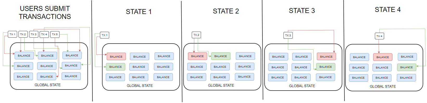 Trong hình, bạn có thể thấy cách người dùng gửi 5 giao dịch. Giao dịch có thể được gửi song song. Lưu ý rằng một số giao dịch điều chỉnh cùng một số dư. Ví dụ: TX 1 và TX 2 trừ một giá trị từ cùng một số dư. Giao dịch TX 3 và TX 4 thêm giá trị vào cùng số dư. TRẠNG THÁI 1 đến TRẠNG THÁI 4 thể hiện việc xử lý tuần tự các giao dịch và do đó cập nhật dần dần trạng thái global. Trạng thái global được tạo thành từ các số dư giống nhau, tức là các đối tượng cố định có trạng thái có thể được thay đổi nhiều lần liên tiếp thông qua các giao dịch.